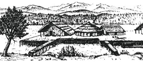 Фото 71. Неолитические жилища, построенные около 5000 лет назад на сваях на озере в Швейцарии. Реконструировано по остаткам дерева, сохранившимся в иле на дне озера. Обратите внимание на сети и лодку.