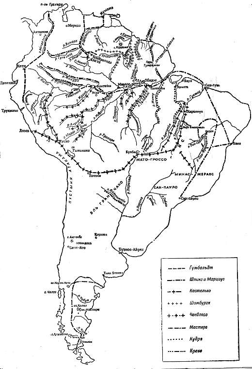 В течение полувека после Гумбольдта путешественники по Южной Америке почти целиком вдохновлялись одними научными интересами. Это видно прежде всего на примере экспедиций в Бразилию, совершенных между 1810 и 1812 гг. Крупные исследования были произведены путешественниками в области к востоку от 50° з.д.: Эшвеге (1811–1814 гг.), принц Максимилиан Вид-Нейвид (1815–1817 гг.), Огюст де Сент-Илер (1816–1822 гг.)„ фон-Шпикс и фон-Марциус (1817–1820 гг.), Поль и Наттерер (1817–1821 гг.). Наттерер проник и за 50° з.д., пересек Матто-Гроссо между верховьями Арагуая и Гуапоре и спустился вниз по последней и по Мадейре к Амазонке. Поль спустился по реке Токантинс ниже Каролины. Кроме этого, Наттерер и Поль вместе путешествовали по внутренним частям нынешних штатов Минас-Жераис и Гойас. Эшвеге и Вид-Нейвид отходили только на короткие расстояния от побережья, но Шпикс и Марциус совершили большие путешествия и добились более крупных результатов, чем все другие. Сначала они проделали сушей путь от Сан-Пауло до Баии, потом пересекли северо-восточную Бразилию до Амазонки. Большая часть посещенных ими областей была уже известна, но все же их экспедиция была связана с крупными достижениями. Вторую половину своей работы они проделали на Амазонке, по которой оба поднялись до Эгас. Шпикс отправился по Амазонке к Табатинге, Марциус проследовал по Жапуре до «подножья стоящей посреди южного континента горы Араскоара, отделенной от Кито лишь одними Кордильерами». Это была первая научная экспедиция на Амазонке после Ла-Кондамина.