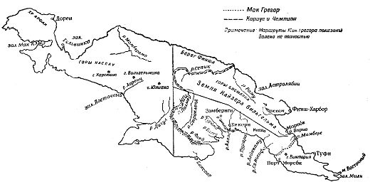 Хотя Новая Гвинея была открыта европейцами еще в начале XVI в., она оставалась неисследованной почти до последнего времени, и не были ясны даже очертания ее берегов. Однако множество исследователей один за другим наносили на карту новые детали или клочки местности, а голландская экспедиция 1826 г. дала многое для ознакомления с юго-западным побережьем острова. Съемки Блеквуда с судна «Флай» (1843 г.), Оуэна Стенли с судна «Ратлснейк» (1849 г.) и Морсби (1873 г.) также повели к появлению на карте многих хорошо известных черт структуры острова. В особенности большое значение имели съемки Морсби. Он открыл ныне носящую его имя гавань, исследовал побережье от залива Астролябии до восточной оконечности острова и окончательно установил контуры острова.