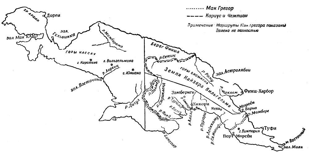 В 1889 г. к большой работе в Британской Новой Гвинее приступил Вильям Мак-Грегор. Он исследовал территорию, прилегающую к заливу Милн, и поднялся по реке Ванапе до горы Виктории в хребте Оуэн-Стенли. Зимой 1889–1890 г. он проплыл 975 км по реке Флай до германской границы. В 1896 г. Мак-Грегор пересек Новую Гвинею от реки Мамбаре до реки Ванапы, а в 1897 г. — в обратном направлении, причем на этот раз он исследовал также северное побережье британской части Новой Гвинеи.