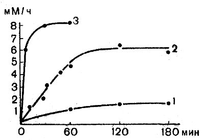 Рис. 21. Влияние частоты и длительности электрического раздражения на скорость транспорта 3-0-метилглюкозы в портняжной мышце лягушки (Holloszy a Narahara, 1965). По оси абсцисс — длительность раздражения, в минутах; по оси ординат — скорость транспорта 3-0-метилглюкозы, измеренная непосредственно после раздражения, мМ/ч. Частота раздражения: 1—3; 2—20; 3—120 имп/мин