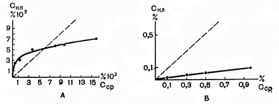 Рис. 24. Зависимость концентрации витальных красителей в аксоне (Скл, %) от концентрации их в среде (Сср, %) в условиях диффузионного равновесия. А — основной краситель нейтральный красный, гигантское волокно каракатицы; Б — кислотный краситель цианол, гигантское волокно кальмара (Кроленко, Никольский, 1963). Пунктирная линия — биссектриса
