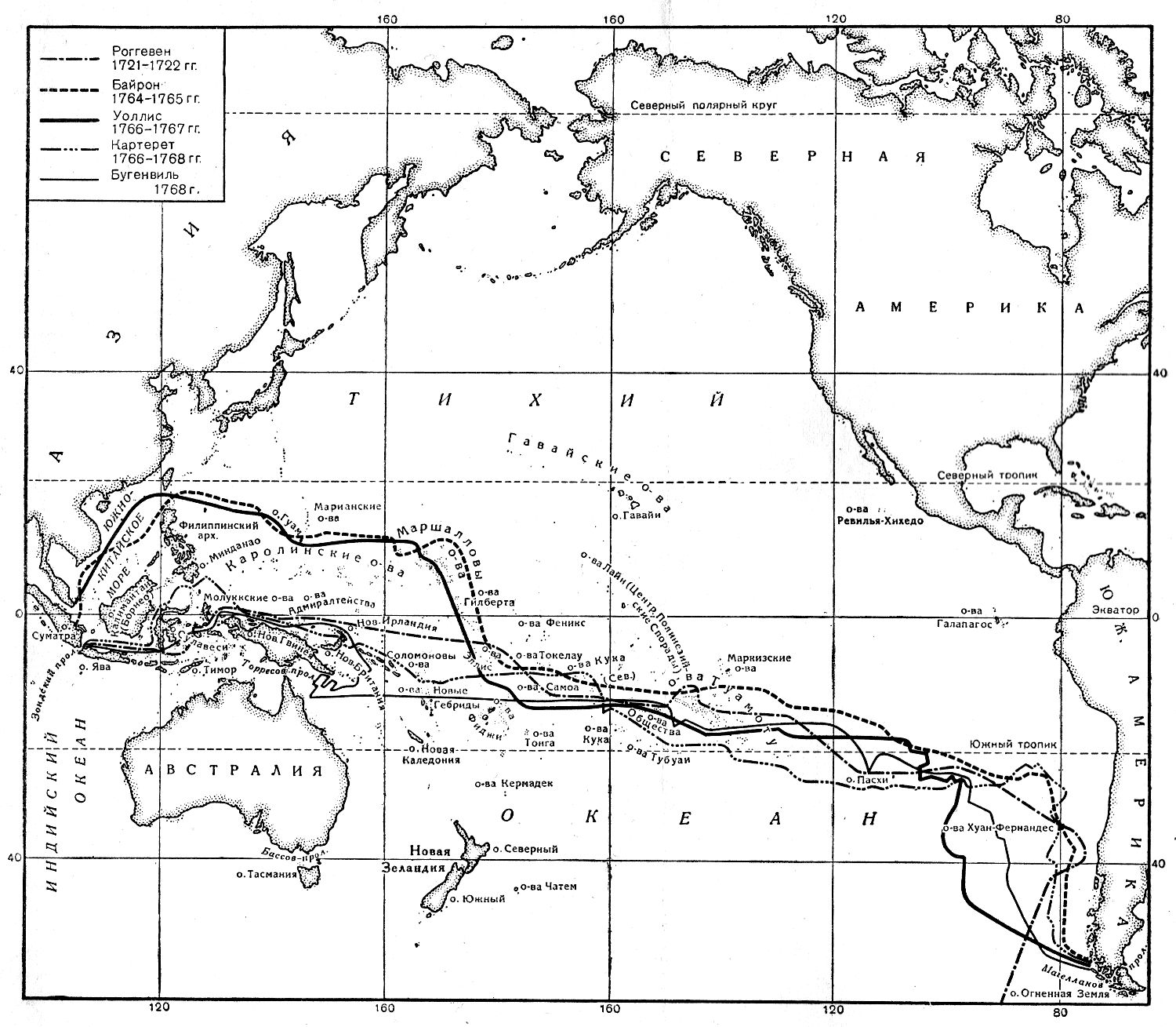 Маршруты Роггевена, Байрона, Уоллиса, Картерета и Бугенвиля Из книги Джемса Кука «Плавание на «Индевре» в 1768—1771 г.г.». Увеличить (в отдельном окне)