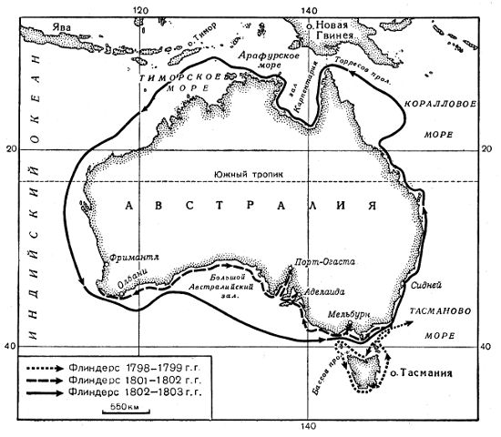 Флиндерсу было всего лишь двадцать один год, когда в 1795 г. он прибыл в Порт-Джексон. Ему поручили обследование берегов Нового Южного Уэльса, и в 1797 г. он вместе с Бассом совершил плавание, в котором приняли участие беглые каторжники. В феврале 1798 г. Флиндерс на корабле «Френсис» отправился к полуострову Вильсонс-Промонтори и оттуда через Бассов пролив прошел к островам, лежащим у северной оконечности Вандименовой Земли. Он открыл группу островов Кент и остров Пирамид. В том же 1798 г. на корабле «Норфолк» Флиндерс отправился к берегам Вандименовой Земли. В этом плавании он обошел вокруг Вандименовой Земли, положив на карту еще никому не ведомый северный берег острова. Он открыл остров Уотерхаус и архипелаг Хантер близ северных берегов Тасмании, бухту Порт-Далримпл — эстуарий крупнейшей на этом острове реки Теймар, и 9 декабря 1798 г. обогнул северо-западную оконечность Тасмании. Флиндерс отметил в своем дневнике: «Ныне мы совершенно убеждены, что между Вандименовой Землей и Новым Южным Уэльсом действительно существует пролив и что этот пролив мы действительно прошли в эти дни». Далее Флиндерс обследовал весь западный берег Тасмании и ряд бухт на ее восточном побережье. Результатом этого замечательного плавания была карта, на которой Тасмания впервые показана была как остров.