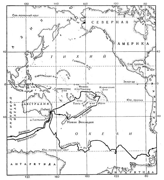 Маршрут Беллинсгаузена и Лазарева Из «Атласа истории географических открытий и исследований». 1959 г.
