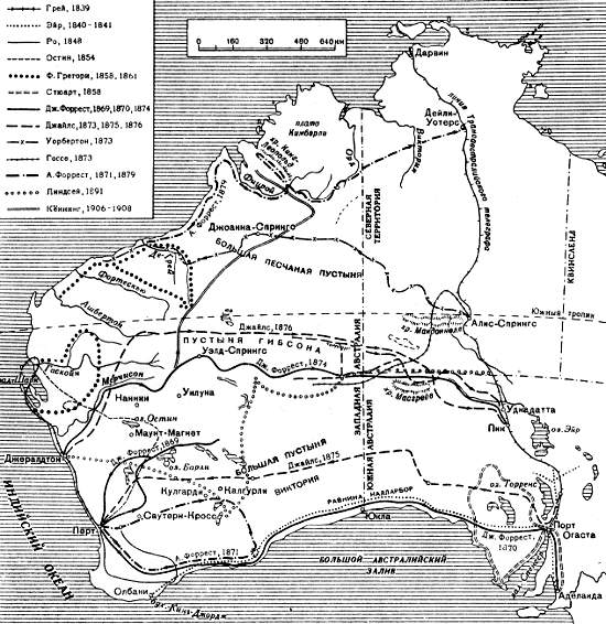 Берк и Стюарт опрокинули барьеры, воздвигнутые природой вокруг центральноавстралийской пустыни. Если прежде подавляющее большинство путешественников ограничивалось исследованиями по периферии центральной Австралии, то после Стюарта многие его последователи стали пересекать внутренние области материка. Обычно пересечения эти совершались в широтном направлении. Меридиональный маршрут Стюарта в начале 70-х годов XIX в. стал трассой трансавстралийской телеграфной линии, а промежуточные станции, расположенные на этой линии,— исходными базами для экспедиций в глубь материка. Эта линия, сданная в эксплуатацию в 1872 г., от Порт-Огасты, гавани, лежащей в глубине южноавстралийского залива Спенсер, вела к западному берегу озера Эйр и затем примерно вдоль 134-го меридиана пересекла центральную Австралию; на севере ее конечным пунктом был Дарвин.