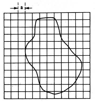 Рис. 9. Квадратная сеточная палетка, наложенная на измеряемую фигуру. Площадь участка Р=a2n, a — сторона квадрата, выраженная в масштабе карты; n — число квадратов, попавших в пределы контура измеряемого участка