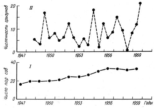 Рис. 2.11. Численность в системе хищник—жертва обыкновенной неясыти Strix aluco (I) и мелких млекопитающих — лесных мышей и рыжих полёвок (II) (по Н. Southern, 1970)