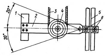 Рис. 2.16. Натяжное устройство: 1 — груз; 2 — рычаг; 3 — канат; 4 — блок; 5 — направляющая кабины; 6 — прижим
