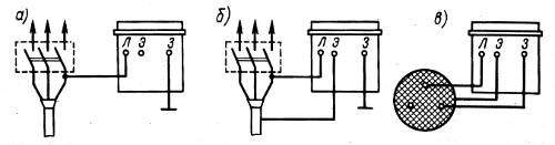 Рис. 4.1. Измерение сопротивления изоляции кабеля мегомметром: а — относительно земли; б — между фазами; в — относительно земли с исключением поверхностных утечек; З — земля; Л — линия; Э — экран