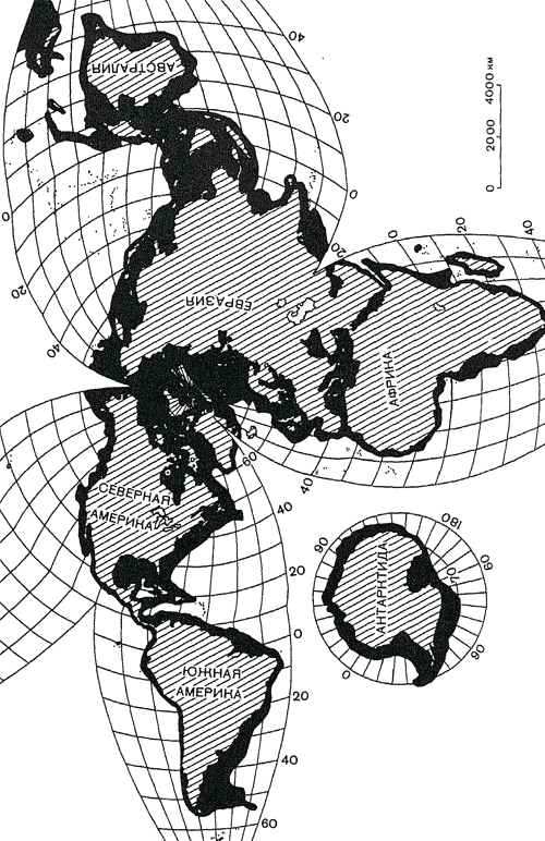 Рис. 16. Континентальные шельфы (показаны черным), если взять их все вместе, увеличивают площадь континентов примерно на 10%. Карта составлена в необычной проекции, чтобы избежать искажений площади континентов и шельфов. Все они показаны почти в одном масштабе (шельфы нанесены по данным Менарда и Смита, 1966).