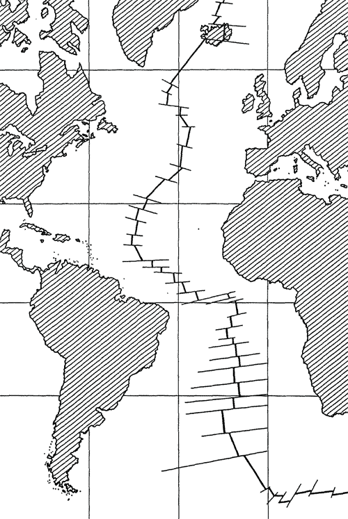 Рис. 22. Рифт, разделяющий на две части дно Атлантического океана. Он разбит на отдельные фрагменты, смещенные влево или вправо по поперечным линиям, представляющим собой разломы, которые продолжаются в глубь земной коры. Продолжение рифта за пределами Атлантического океана смотри на рисунке 25.