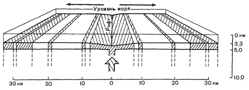 Рис. 21. Широтный профиль дна средней части Атлантического океана. Виден рифт (в данном месте глубиной около 1800 метров), по которому происходит поднятие базальтовых лав.