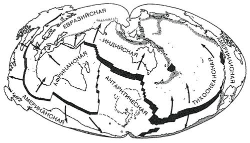 Рис. 25. Главные плиты коры движутся, как показано стрелками, удаляясь от рифтовых зон (черные полосы), в которых происходит поднятие лавы, и по направлению к зонам (заштрихованные полосы), где происходит медленное погружение корового вещества в глубь тела Земли.