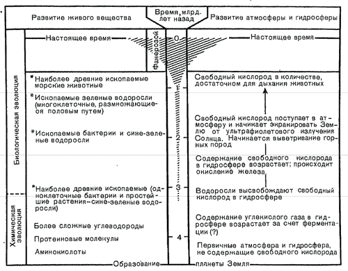 Прежде чем двигаться дальше, следует более внимательно изучить шкалу времени, которой нам предстоит пользоваться. Как мы уже говорили (см. табл. 2), ископаемые остатки, найденные в породах, показывают, что приблизительно 3,2 миллиарда лет назад в море уже существовали как простейшие, так и очень примитивные растения. Так как литосфера образовалась около 4,5 миллиарда лет назад, мы имеем промежуток времени продолжительностью около 1,3 миллиарда лет, в течение которого образовалось и развивалось живое вещество. Этот промежуток времени вдвое длиннее всего фанерозоя, со всей его долгой и сложной историей развития биосферы, что само по себе более чем достаточно. В течение этих 1,3 миллиарда лет в среде, лишенной свободного кислорода, должно было возникнуть и затем развиться до уровня простейших и примитивных растений живое вещество. Рассматривая эти события, мы должны также учитывать, что позднее кислород появился в атмосфере в больших количествах, потому что без этого не могли бы возникнуть животные.