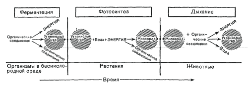 Рис. 29. Теоретическая последовательность процессов, которая могла привести к образованию основных групп ныне живущих организмов. Количество энергии, высвобождающейся при дыхании, значительно больше того, которое высвобождается при ферментации, что показано различным размером надписей.