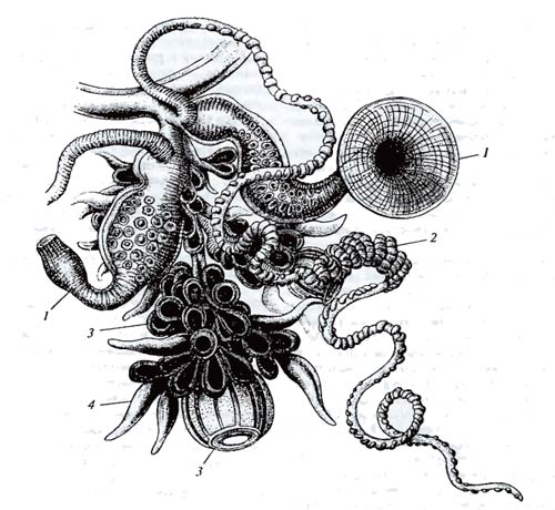Рис. 4.3. Часть колонии сифонофоры Salacia (из Э. Геккеля, 1896). Единая на первый взгляд особь представляет собой колонию. Исходный индивидуум размножается почкованием; отпочковывающиеся особи могут вести самостоятельную жизнь или стать частями материнской колонии. 1 – питающие, 2 – стрекающие, 3 – половые, 4 – чувствующие группы особей
