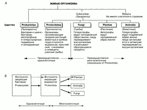 Рис. 2.4. А. Классификация по Маргелису и Шварцу: все организмы разделяются на пять царств. Вирусы не соответствуют ни одной из групп в данной классификации живых организмов, поскольку они устроены слишком просто, не имеют клеточного строения и не способны существовать независимо от других организмов. Б. Эволюционные взаимоотношения между пятью царствами. Как видно из схемы, начиная с протоктистов, эволюция происходила в направлении многоклеточности.