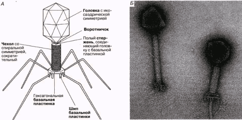 Рис. 2.19. А. Строение бактериофага Т2. Б. Электронная микрофотография бактериофага, полученная методом негативного контрастирования.