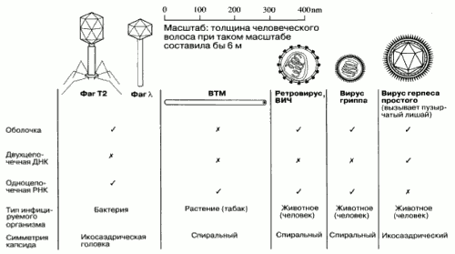 Рис. 2.20. Несколько упрощенных схематических изображений вирусов, отражающих различие их симметрии и размеров. Фаг Т2 показан с нитями хвостового отростка, которые фаг выпускает перед тем как инфицировать клетку; у фага λ нитей хвостового отростка нет.