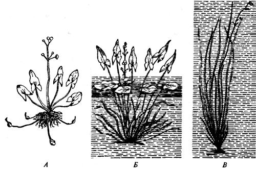 Рис. 8.1. Стрелолист обыкновенный (Sagittaria sagittifolia) формирует разные по форме листья при развитии на суше (А) и в воде (Б). Сигналом для развития водной формы листьев (В) служит не непосредственное действие воды, а затенение (Б. Уоллес, А. Шрб, 1964)