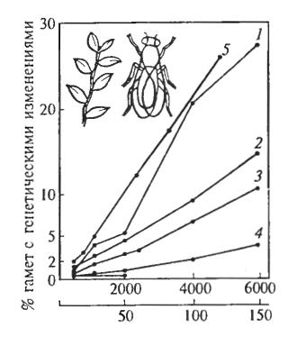 Рис. 8.3. Повышение частоты мутаций под воздействием радиации: зависимость частоты разных типов мутаций дрозофилы и традесканции от дозы радиации (по Н.П. Дубинину и др., 1936; из СМ. Гершензона, 1983): 1 — частота хромосомных перестроек; 2 — частота рецессивных деталей, сцепленных с полом; 3 — частота тех же мутаций, свободных от хромосомных перестроек. 4 — частота тех же мутаций, связанных хромосомными перестройками, 5 — число делеций у традесканции (в диапазоне доз от 0 до 50 рентген)