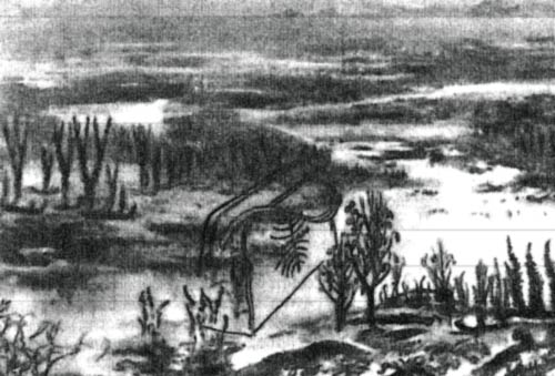 По мере того как растения приспосабливались к различным условиям, они постепенно дифференцировались, образуя все большее количество видов. К концу девона, то есть 360 миллионов лет назад, растительность стала иметь уже совсем другой облик. Выделялись папоротниковидные растения, предки настоящих папоротников. Они не давали семян; некоторые из них достигали 12 метров в высоту и около одного метра в диаметре ствола у основания. Представив себе эти размеры, мы можем сказать, что первые леса на Земле начали возникать в позднедевонское время. Кроме древовидных растений, в этот период времени существовали крупные хвощи и плауны, потомки более мелких видов, живших ранее в девоне. На фото 25 изображена другая реконструированная картина, предположительно показывающая облик позднедевонского ландшафта.