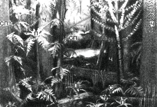 Фото 26. Реконструкция болота позднекаменноугольного времени с обычной для таких болот пышной растительностью. П - папоротники, X - хвощи, Ч - лепидодендроны - «чешуйчатые деревья», СП - семенные папоротники; видна также большая стрекоза. Некоторые хвощи достигали в высоту 30 м.