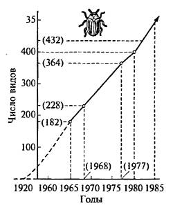 Рис. 21.1. Возрастание числа видов насекомых и клещей, поражающих сельскохозяйственные культуры и ставших устойчивыми к применяемым пестицидам в результате бессознательного отбора (по А.В. Яблокову, С.А. Остроумову, 1991)