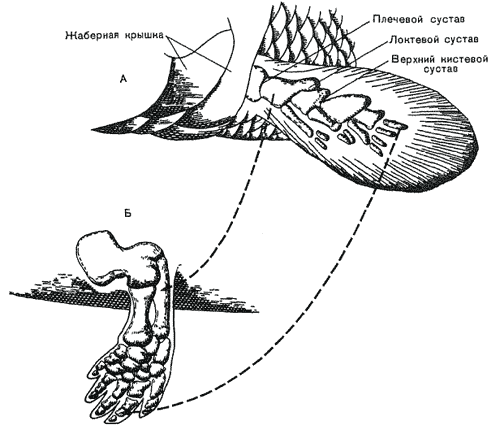 Рис. 42. Превращение плавников рыб в пятипалую конечность (не в масштабе). А. левый передний плавник девонской кистеперой рыбы. Б. Левая передняя конечность палеозойской амфибии. (Пунктирными линиями показаны соответствующие друг другу кости на рис. А и Б.)