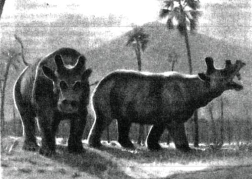 Фото 48. Uintatherium, травоядное млекопитающее массивного сложения, высотой около 1,5 м на фоне реконструированного эоценового ландшафта. Его причудливо украшенный череп едва ли был полезен при обороне или при нападении. Возможно, он привлекал особей противоположного пола, а если так, то естественный отбор мог способствовать развитию этих выростов.
