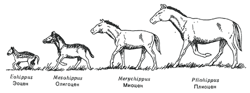 Рис. 58. Четыре вида лошадей, живших в различные эпохи. Eohippus и Mesohippus в действительности были еще меньше по отношению к более поздним лошадям, чем это показано на рисунке.