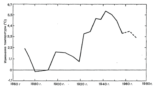 Климат после 1800 г. Данные измерений температур, производившихся правительственными учреждениями в большинстве стран, показывают изменения температур с начала XIX в. В самом общем виде эти изменения приведены на кривой рисунка 64. Она свидетельствует о том, что за последние сто лет средние годовые температуры увеличивались более чем на полградуса Цельсия, причем это увеличение шло неравномерно. Оно затронуло большую часть планеты, как тропические, так и высокие широты, как северное, так и южное полушарие. Затем, после 1940 г., начался период похолодания. Температуры понизились, и к 1970 г. достигли того уровня, который наблюдался около 1920 г. Таким образом, устанавливается тот факт, что климаты Земли не являются чем-то постоянным и неизменным, но подвергаются существенным изменениям. Теплые зимы и жаркие летние сезоны, отмечавшиеся в 30-х годах двадцатого века на западе США, представляются частью общего потепления климата, проявлявшегося в широких масштабах.
