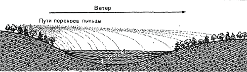 Рис. 65. Болото, занимающее впадину в ледниковых отложениях, в котором ежегодно отлагается пыльца растений, произрастающих в окрестностях. Постепенно в нем накапливаются слои опавших листьев, стеблей и других растительных остатков, образующие торф.