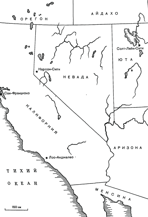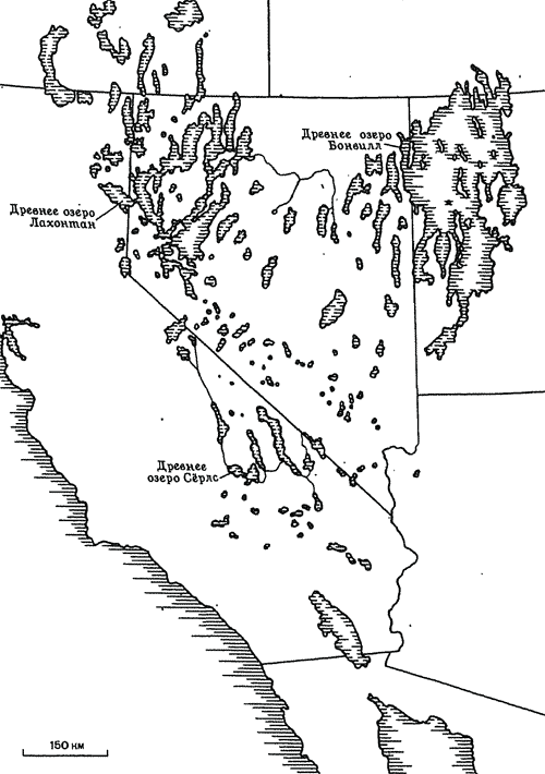 Рис. 67. Схема части района Хребтов и Впадин и прилежащей территории, показывающая: Б. озера, существовавшие 20 000-15 000 лет назад. Увеличение количества озер в северной части района было результатом менее жаркого климата.