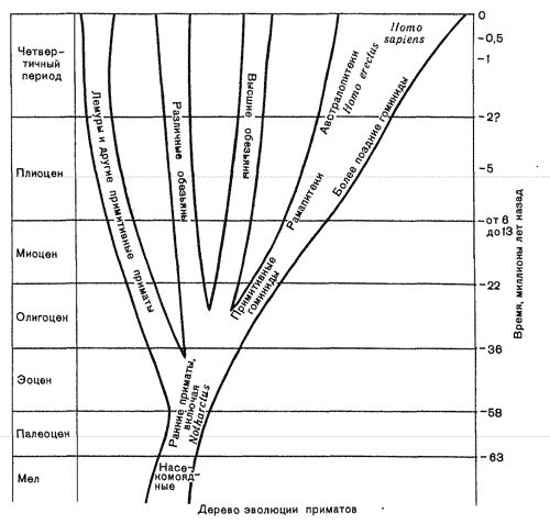 Однажды выделившись в отдельную группу, приматы сами начали разделяться, образуя различные разновидности, развивающиеся в различных направлениях, как можно видеть на рисунке 72. Первыми выделились различные, но довольно примитивные разновидности, такие, как лемуры, которые бегали по ветвям, как белки. Следующими были мелкие обезьяны, постепенно развившиеся во множество видов. После этого произошел важнейший раздел между линией крупных обезьян и линией гоминид (не вполне четкий термин, означающий «человекоподобные»). Представители линии крупных обезьян продолжают жить на деревьях и сейчас, после длительной эволюции, представлены четырьмя близкими родами: шимпанзе, горилла, гиббон, орангутан. Напротив, ветвь гоминид включает не только человека, но также и более ранних человекообразных приматов, которые отличались от обезьян. Как показано на рисунке 72, разделение обезьян и гоминид произошло в олигоцене, около 25-35 миллионов лет назад. После этого долгое время обе ветви продолжали по крайней мере часть времени проводить на деревьях.