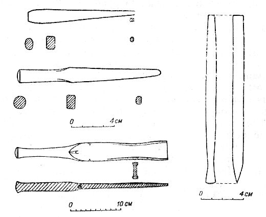Слева: Медные орудия для обработки камня; справа: медный резец каменщика