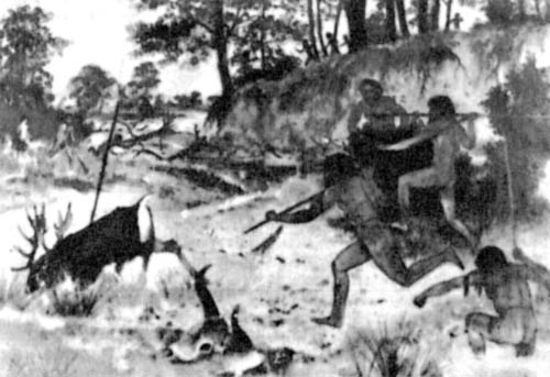 Фото 67. Реконструкция охоты на оленя группы людей, которые являются одними из самых ранних Homo sapiens. Место действия напоминает современный Сванскомб на берегу Темзы приблизительно в 30 км ниже по течению от Лондона. Время действия более 200 000 лет назад.