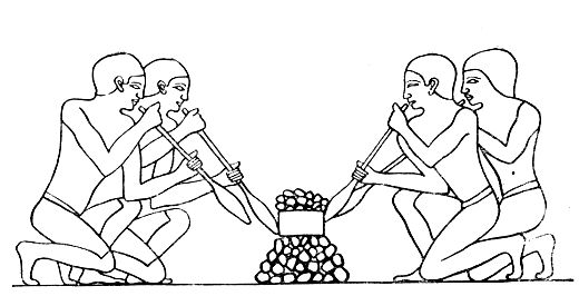 Судя по изображениям, можно полагать, что извлеченная из печей медь плавилась затем в глиняных тиглях. Для получения высокой температуры, необходимой для плавки (1053° С), плавильщики прибегали к усиленному дутью при помощи так называемых паяльных трубок. Один конец тростниковой трубки, снабженной глиняной нашлепкой для предохранения ее от огня, вкладывали непосредственно снизу в огонь костра или в специально оставленное отверстие в нижней части глиняной стенки, окружавшей костер. Другой конец трубки металлург брал в рот и дул. Обычно поддували одновременно несколько человек с разных сторон. В результате напряженной работы нескольких металлургов пламя направлялось под тигель, и металл плавился.