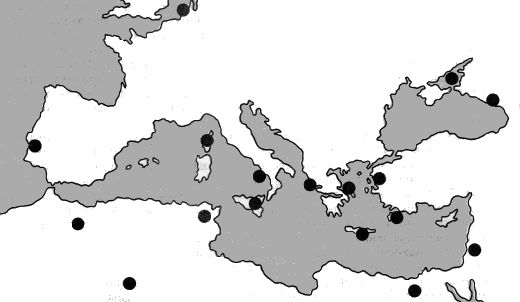 Рис. 2. На карте черными точками отмечены места, в которые различные исследователи помещали Атлантиду