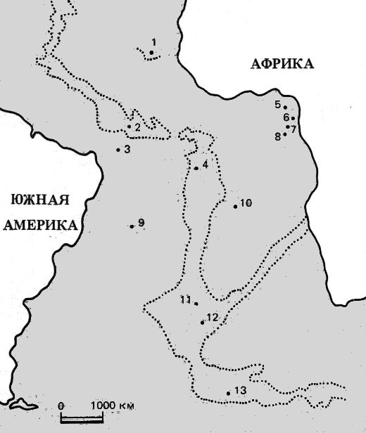 Рис. 9. Острова южной части Атлантического океана: 1 – Зеленого Мыса, 2 – Сан-Паулу, 3 – Фернанду-ди-Норонья, 4 – Вознесения, 5 – Биоко, 6 – Принсипи, 7 – Сан-Томе, 8 – Пагалу, 9 – Триндади, 10 – Св. Елены, 11 – Тристан-да-Кунья, 12 – Гоф, 13 – Буве. Пунктирной линией отмечена южная часть Срединно-Атлантического хребта, а также хребет Китовый
