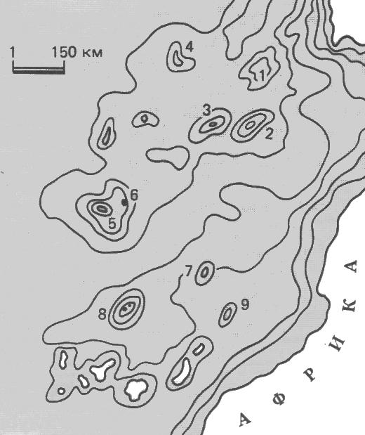 5. И наконец, самое важное «доказательство». Р. Кольбе (1957), обрабатывая образцы, собранные шведским океанографическим судном в экваториальной Атлантике, к своему большому удивлению, нашел в осадках остатки пресноводных диатомовых водорослей в Местах, обозначенных на рис. 14 точками. Не смесь пресноводных и морских водорослей, а исключительно пресноводных. При этом слой, из которого Кольбе взял образцы для анализа, относился к плейстоцену. Таким образом, эти осадки образовались от миллиона до нескольких сотен тысяч лет назад. На первый взгляд кажется совершенно очевидным, что они могли образоваться только в пресноводной среде, в каком-нибудь озере, которое тогда располагалось на выступающей части хребта.