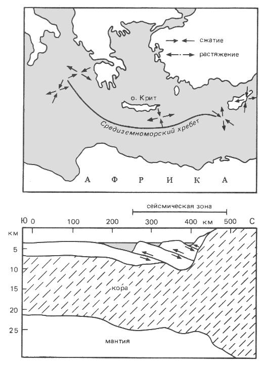 Рис. 21. Тектоническая схема восточной части Средиземного моря. Вверху: расположение подводного хребта. Стрелки показывают напряжение земной коры. Внизу: гипотетическая реконструкция тектонической структуры. Согласно этой схеме, происходит поддвиг африканской плиты под европейскую и распад ее на блоки. В результате возникает структура: подводный желоб – островная дуга. Подобная картина наблюдается и в Тихом океане. (По данным Д. Стэнли, 1972)