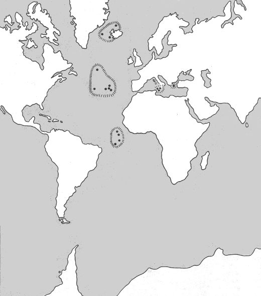 Рис. 26. Современная вулканическая деятельность в морях и океанах. Изображены только Атлантический океан и Средиземное море. Карта (в масштабе 1:100 000 000 по экватору) показывает, что существует несколько центров подводной вулканической деятельности. В Атлантике они располагаются около Исландии, Азорских островов и островов Зеленого Мыса, в Средиземном море – между Сицилией и Тунисом и в Эгейском море