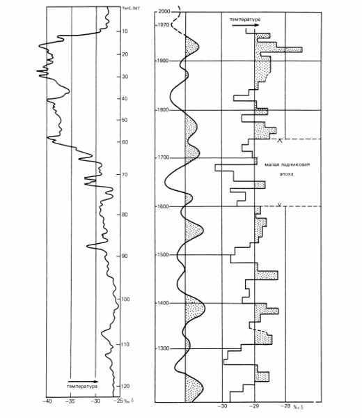 Посмотрим еще раз, что могут нам сообщить ледовые керны, взятые в гренландских и антарктических ледниках. Вот колонка, взятая на станции Кэмп-Сентури в Гренландии (рис. 34). Потепления и похолодания развивались параллельно в американском и европейском регионах. Можно видеть, что примерно 70 000 лет назад начался последний ледниковый период. Совпадает и время его окончания. То, что палеотемпературы определялись с помощью заслуживающих доверия методов, подтверждают, кстати, и исторические события. В Европе известен так называемый малый ледниковый период, приходившийся на 1600–1740 годы. Новое сильное похолодание было зафиксировано около 1820 года. Были и потепления, отмеченные в середине XVII и XVIII столетий и сравнительно недавно, около 1930 года. Исторические факты согласуются с данными радиоизотопного анализа гренландского льда. Эти данные можно экстраполировать на близкое и отдаленное будущее. Если сегодняшние природные условия сохранятся, в последующие два-три десятилетия похолодает, потом наступит значительное потепление, а максимальные температуры придутся на 2010– 2020 годы. При этом, однако, не учитывается такой важный фактор, как загрязнение атмосферы, которое, безусловно, скажет свое веское слово. Все это, разумеется, чистая теория, хотя и базирующаяся на реальных наблюдениях.