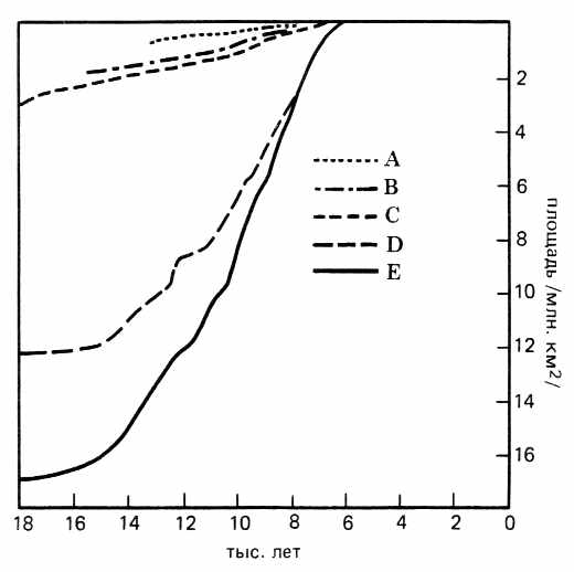 Рис. 36. Таяние ледников за последние 18 000 лет. Кривые показывают площадь, которую занимали на поверхности Земли основные ледники. A – аляскинский, B – кордильерский, C – скандинавский, D – канадский, E – сумма площадей всех основных ледников. (По К. Турекиану, 1971)
