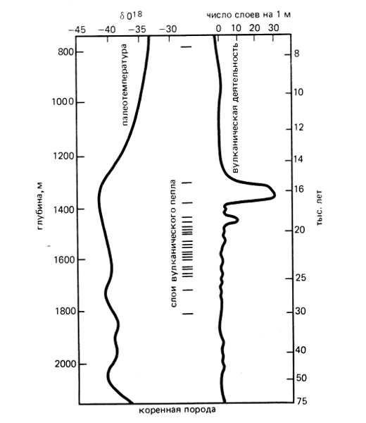 Рис. 37. Кривые палеотемператур и интенсивности вулканической деятельности, полученные путем исследования пробы льда на станции Бёрд в Антарктиде. Ледяной цилиндр длиной свыше 2200 м отразил 75 000 лет геологической истории. В нем были обнаружены слои вулканического пепла. Выяснилось, что чем интенсивнее и мощнее была вулканическая деятельность, тем ниже были средние температуры. (По А. Гоу и Т. Вильямсону, 1971)