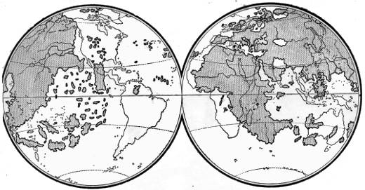 Карта мира по Бехайму, 1492 г. Карта Бехайма наложена на современную карту мира; массивы суши, выходящие за пределы старых представлений об их начертаниях, представляют открытия, сделанные со времен Бехайма.