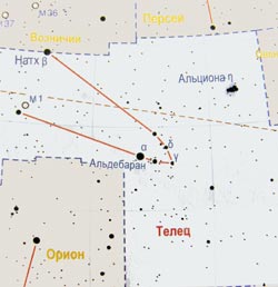 α Тельца (Альдебаран) – гигант спектрального класса K5, нерегулярно меняющий свой блеск от 0,78 до 0,93m. Удален от СОлнца на расстояние 65,1 св. лет.