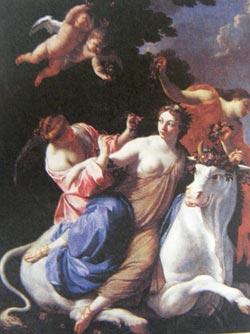 Чтобы не испугать Европу и ее подруг, он превратился в белоснежного быка и незаметно присоединился к стадам царя Агенора. Когда Европа отошла от своих подружек, к ней подошел белоснежный бык и стал смотреть на нее своими большими глазами, а затем лег у нее в ногах. Она же взяла его за рога и уселась на его широкую спину. Вдруг бык взметнулся и помчался к морю. Испугалась Европа, закричали подруги, а бык, тем временем, бросился в воду и стремительно поплыл, рассекая волны. От страха Европа еще крепче ухватилась за его рога.